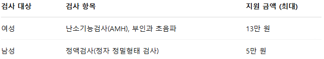 - 여성 13만 원 / 남성 5만 원 검사비 지원